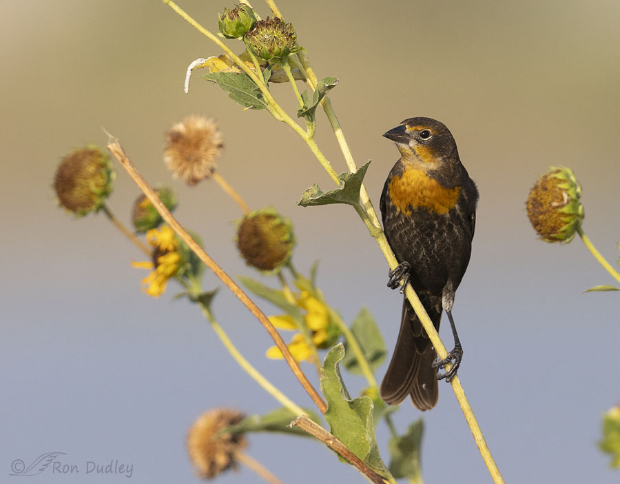 My first impression of this photo, taken three days ago at Bear River MBR, when I saw it on my big screen was that it wouldn’t win any awards but it was still pretty nice. The female Yellow-headed Blackbird is in fine fettle, she’s in good light on a natural perch that includes flowers, buds and seed heads and I like the bi-colored, clean background. She’s even color coordinated with the sunflower and the upper background.