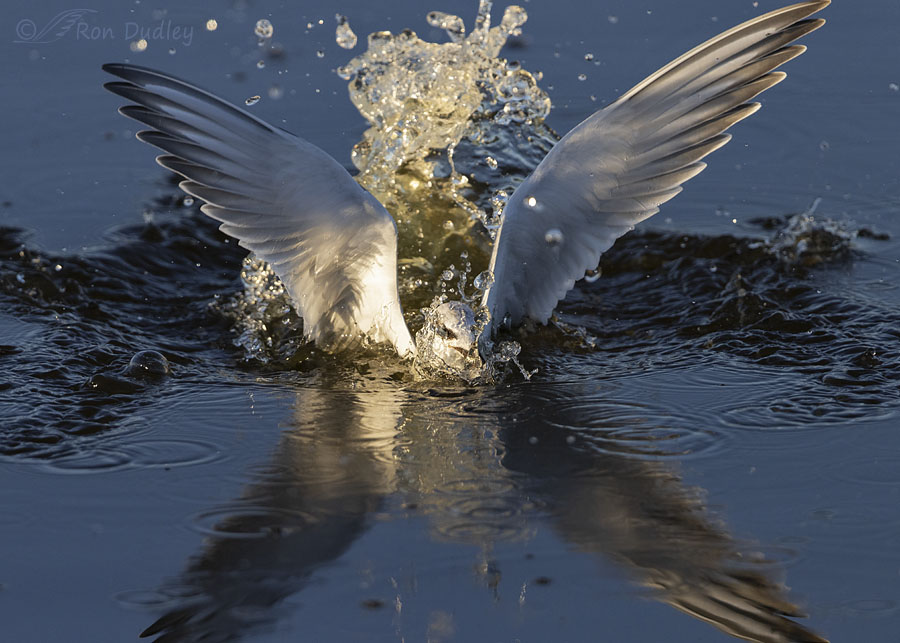 I did get a few interesting ones. This one was taken immediately after the tern hit the water. It’s high contrast and I clipped wings in both the bird and its reflection, but it still grabs my eye.