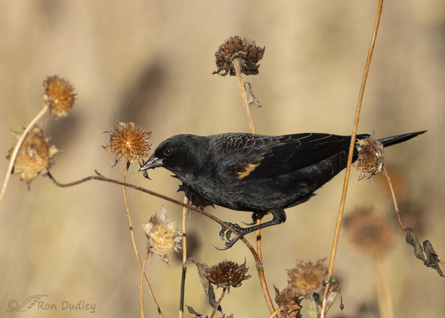 Four days ago I spent far too much time trying to get takeoff/flight shots of this male Red-winged Blackbird. It should have been much easier than it was. He was feeding on the seeds of a large patch of sunflowers and he repeatedly took off to land on another nearby sunflower, which gave me several dozen chances for takeoff and flight shots.