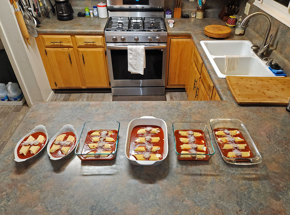 I spent most of the day grocery shopping and slaving away in the kitchen and ended up with a boatload of cheese manicotti. We had manicotti for dinner last night and I’ll freeze most of the rest. I’ll give one pan of it to my ex-wife and still very good friend Diane Olson. Diane’s addicted to my manicotti and has been for decades, so she always (and I do mean always) gets her fair share.