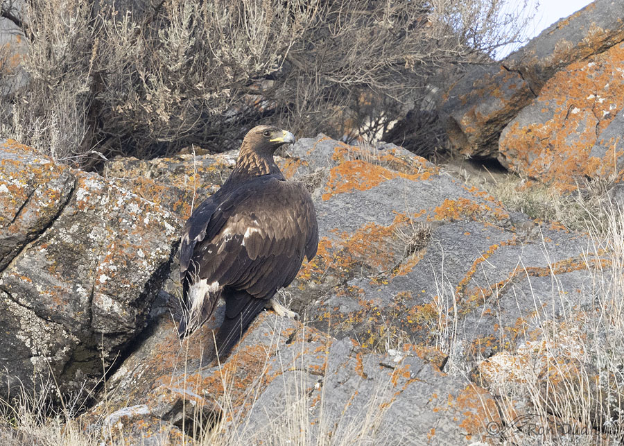 A far-away Golden Eagle that was trying to decide if I was already too close for comfort. A few seconds later ‘he’ took off but all of my flight shots were soft because he was so close to the rocks in the background I couldn’t keep my active focus point locked on him. All I got was more sharp rocks with a soft bird.