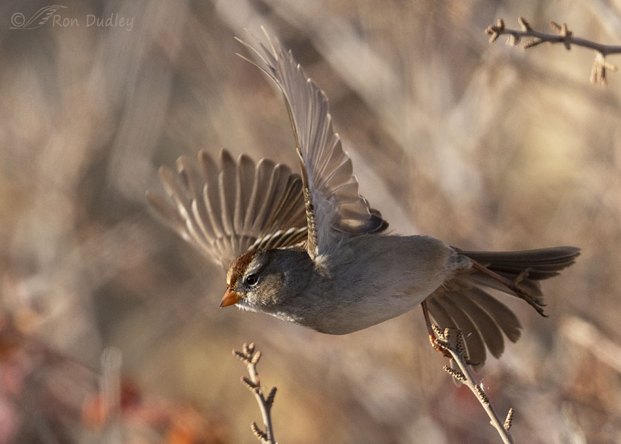 A White-crowned Sparrow at takeoff. Flight shots were a real challenge in the sidelight. At least I got light in the bird’s eye.