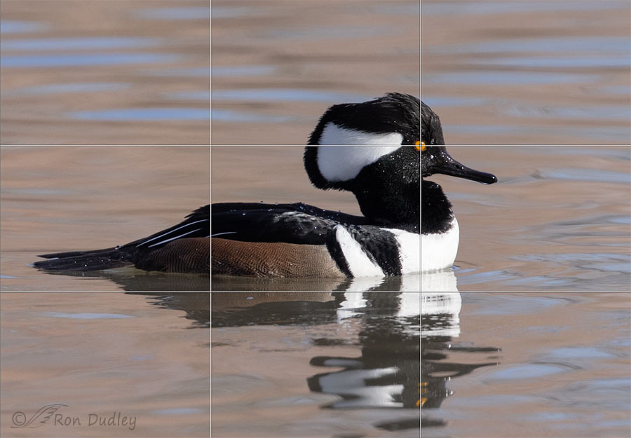 But while I was playing with the photo in Photoshop I noticed something about it that I found interesting and quite unusual. The “rule of thirds” actually worked with it. When I placed the merganser to my liking within the frame I’d chosen, the bird’s eye, the most important element of the photo, was…