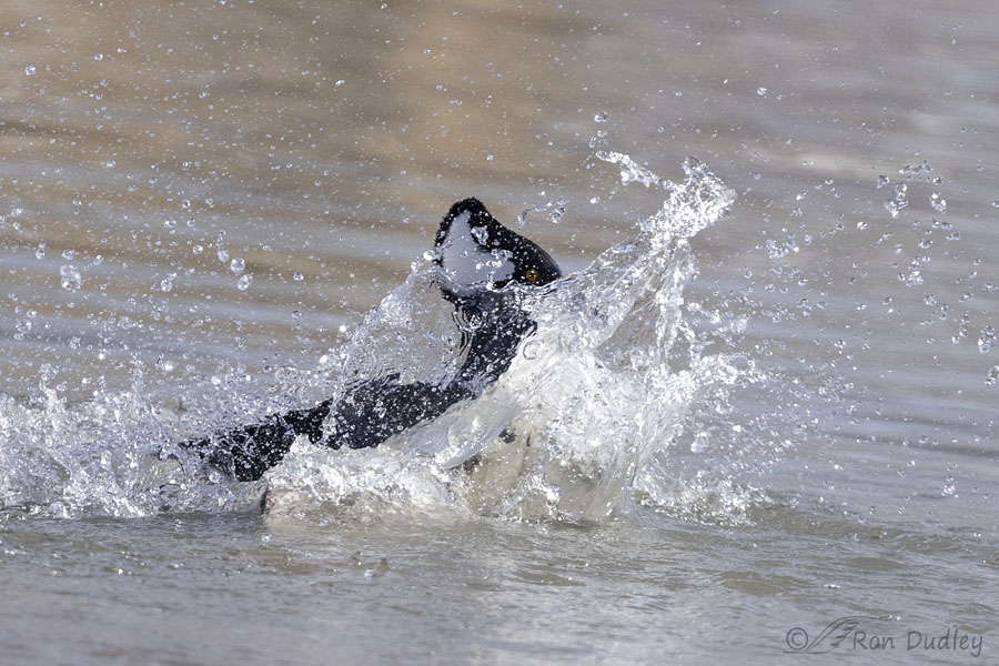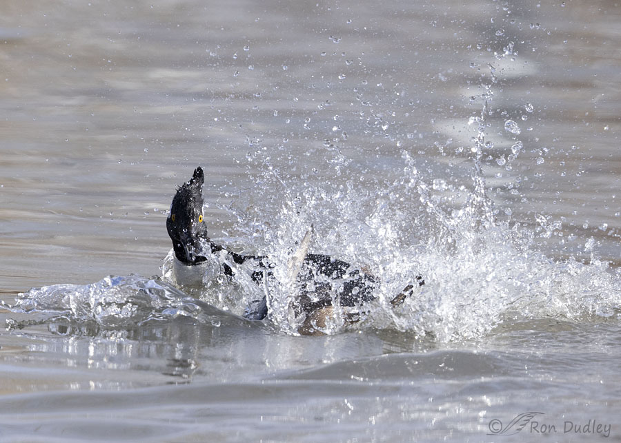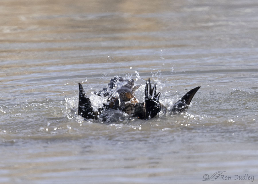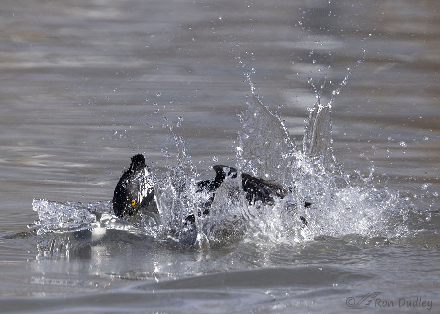 It was a pretty extended fight but it was difficult to photograph because one or both birds were usually partially or completely underwater. Most of my photos show violent water splashes while the combatants were underwater or mostly hidden by flying water.