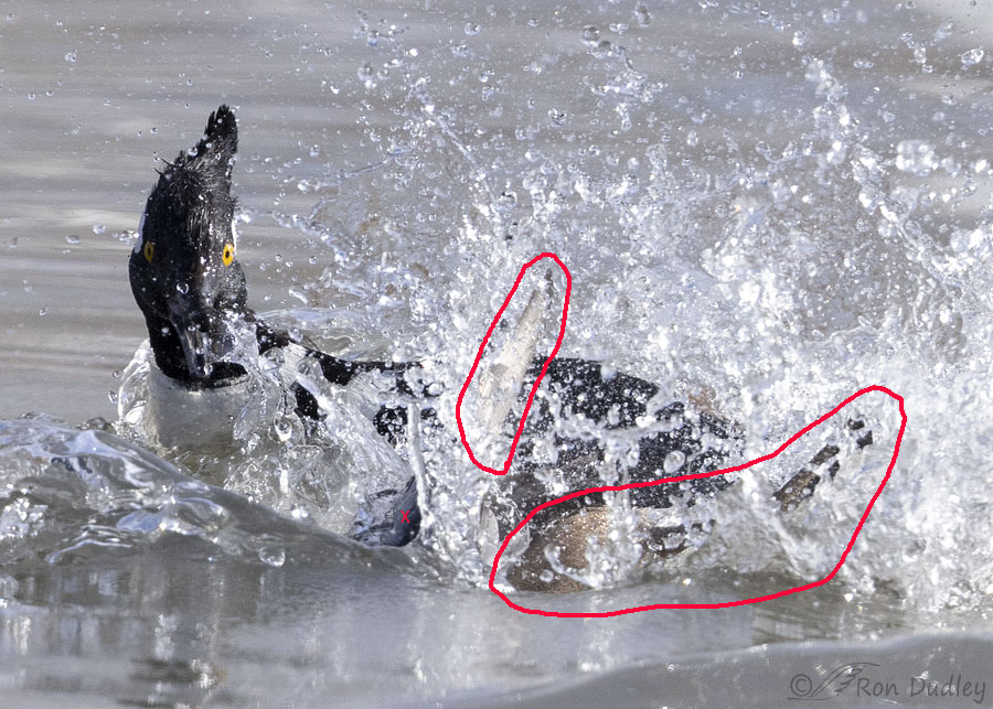 In this closer crop of the same photo I’ve outlined the upside down loser’s wingtip in red (upper left) and his right leg and foot also in red (at lower right). I believe that we can also see part of the loser’s bill that I’ve marked with a small red “x”.