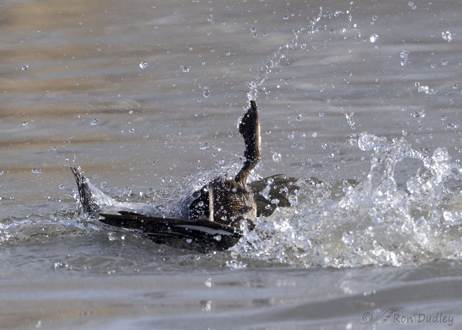 In an instant the drake on top had gone underwater and left this one still floundering upside down.