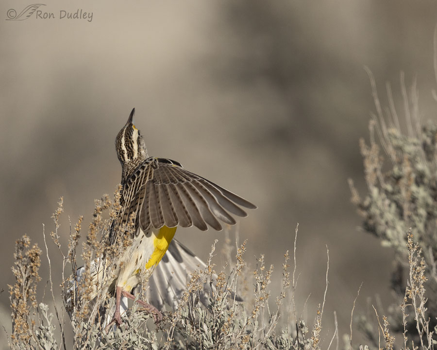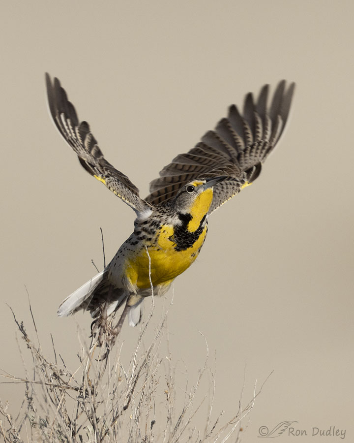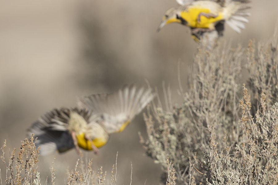 But this time, at the last second, both meadowlarks jinked. Just before they met in midair the incoming bird turned to his right and flew away while the bird at lower left dived to the ground to the left of the largest sagebrush.