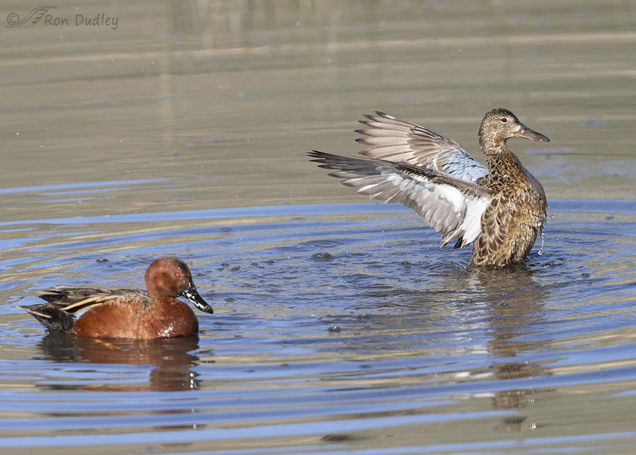 For a few seconds she bathed, with all or most of her body underwater. In Cinnamon Teals it’s typical for both sexes to bathe after copulation but this time the male chose not to do so. He didn’t flap his wings either.