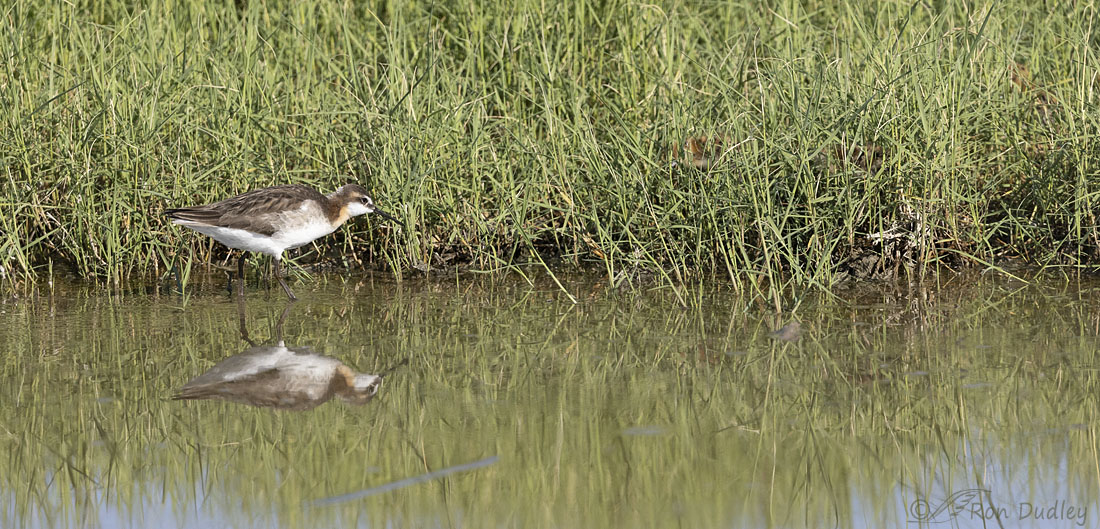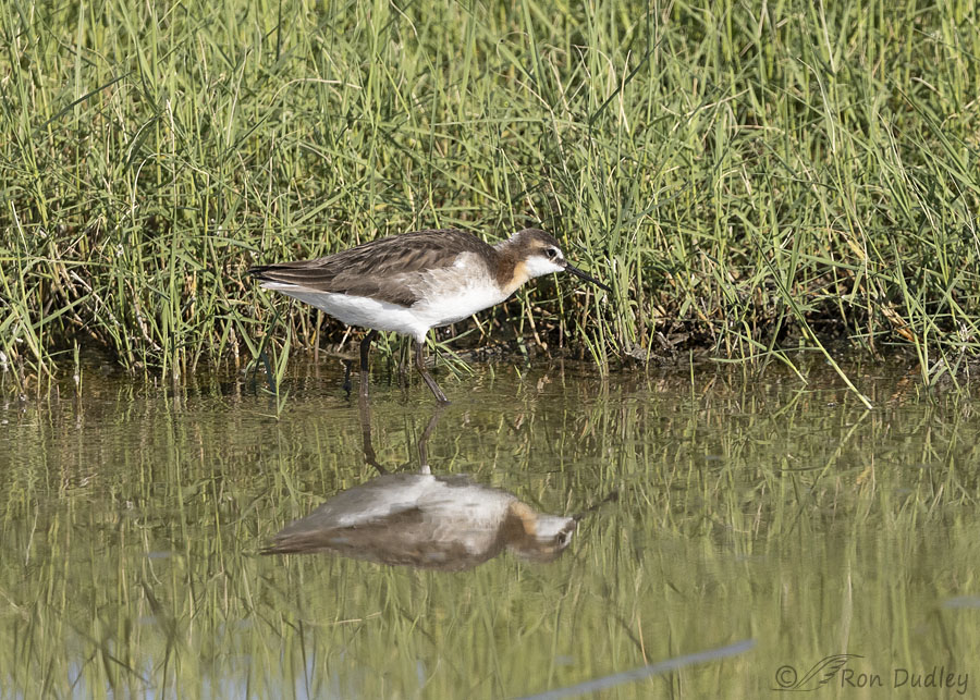 The only reason I took this photo is because I was curious about what the male phalarope was doing. His normal feeding behavior changed as he poked around the edge of this green island in a large body of very shallow standing water. He wasn’t picking tiny insects off of the grasses as I’d seen him and other phalaropes doing. His behavior was curious but hard to explain. It was just different than it had been.