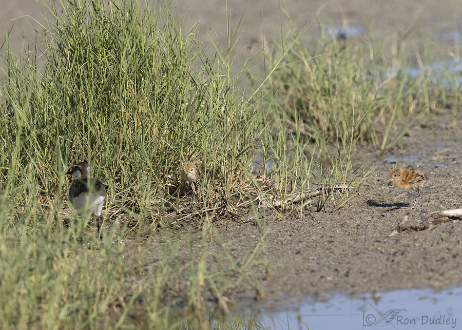 A different crop of the same photo begins to explain his behavior. Sharp eyes will notice three tiny reddish chicks hidden in the grasses in front of him. The chicks were cautiously making their way down to join their dad.