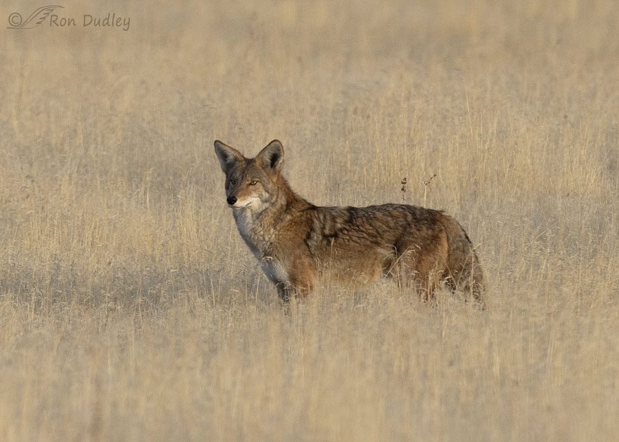 The same photo, uncropped. I don’t know why but I like seeing the coyote smaller in the frame in all that grass. The soft but very long shadow of the coyote accurately indicates that the photo was taken only minutes after sunrise.