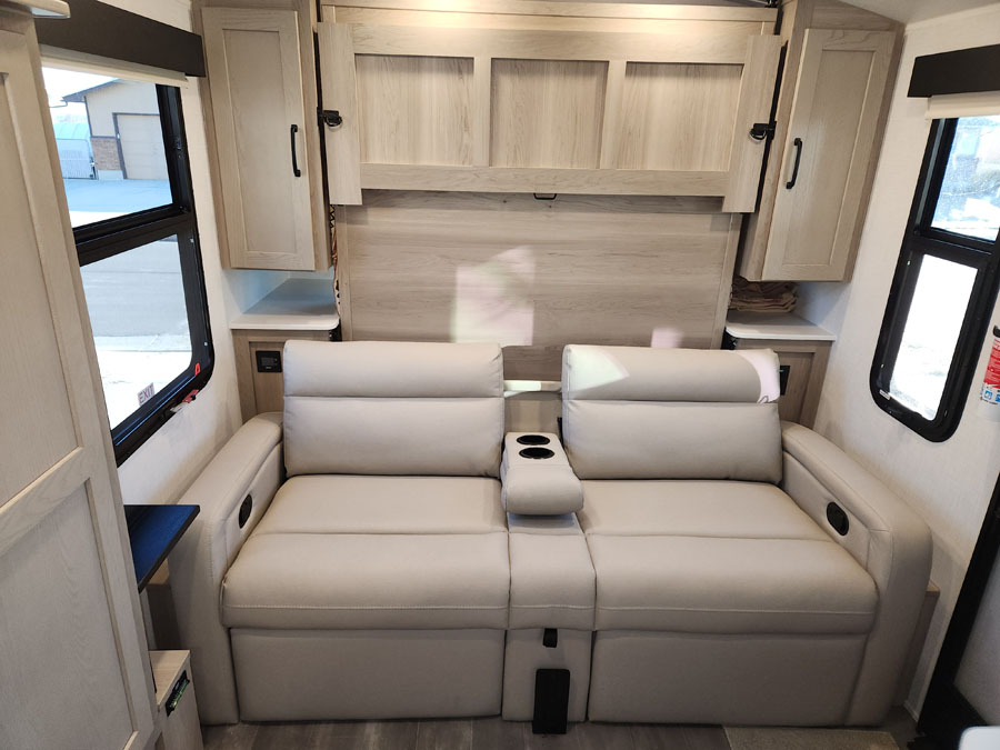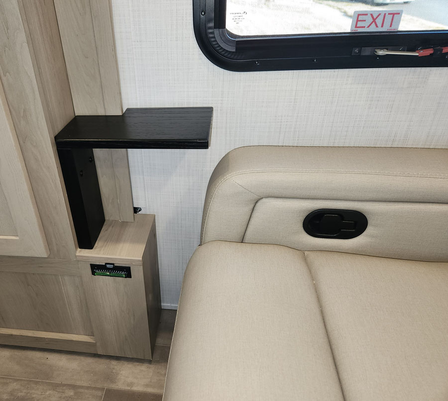 There’s a small rotating table that attaches to the black bracket at the bottom of the sofa but when I have the table removed there’s no convenient place to set drinks or anything else. Those two black drink holders in the drop-down arm rest are worse than worthless. They’re only about an inch deep, they’re too wide and worst of all – they’re too far back to reach with a drink while you’re sitting on the sofa, especially with my bad back. I don’t twist well.