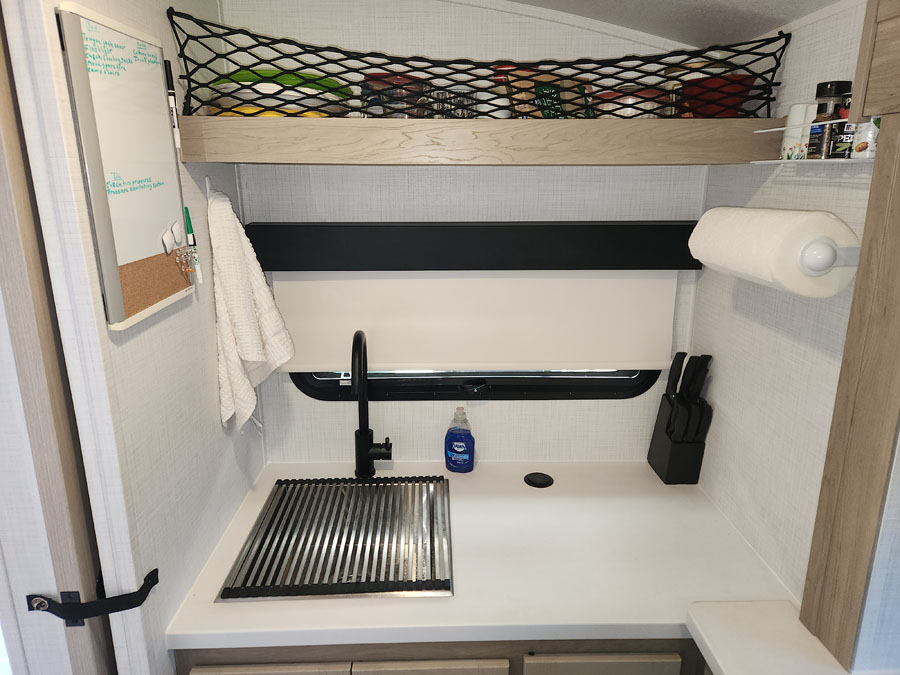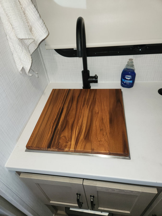 That roll-up contraption over the sink that came with the trailer is a joke. It’s flimsy, it doesn’t stay in place and for obvious reasons it can’t be used as a cutting board. It’ll end up in the trash.