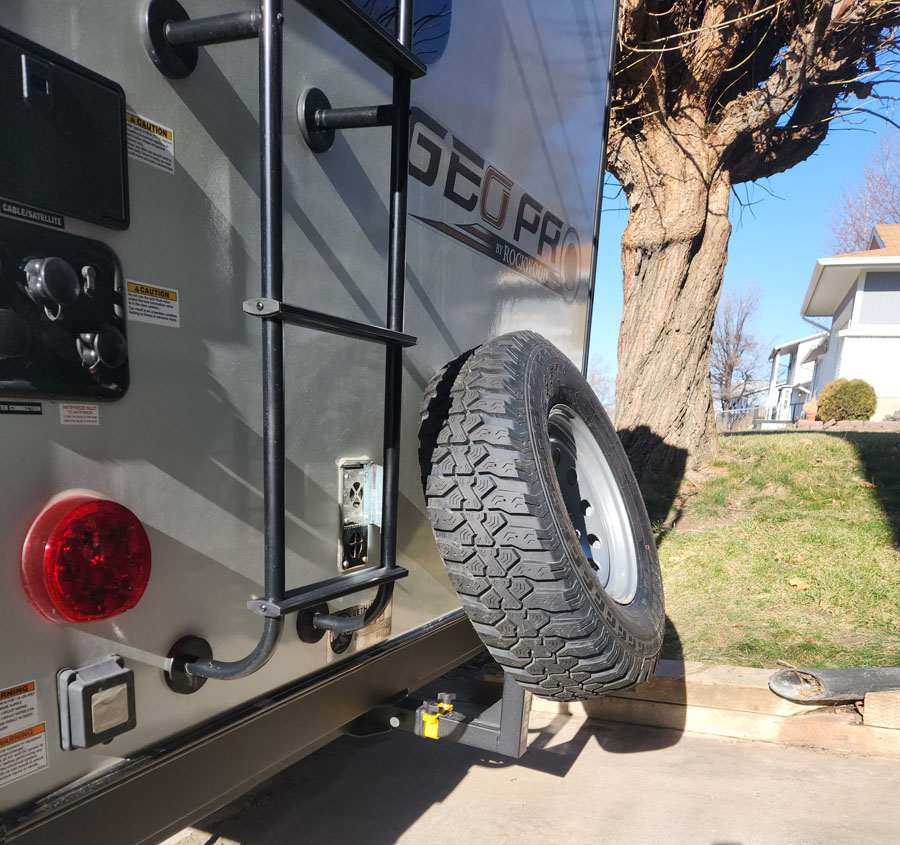 But at least there’s a receiver on the back of my trailer. So, I ordered a spare tire carrier from eTrailer.com (about $123) that fits the 2″ receiver on the back of my trailer and that solved the problem. I no longer have a bottom-dragging spare tire under my trailer.