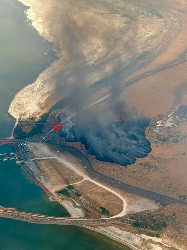 PS – In case you’re curious, this is an aerial photo of last year’s fire in progress. The vehicle I’ve circled in red is at almost the exact location I was when I took these meadowlark photos from my pickup.
