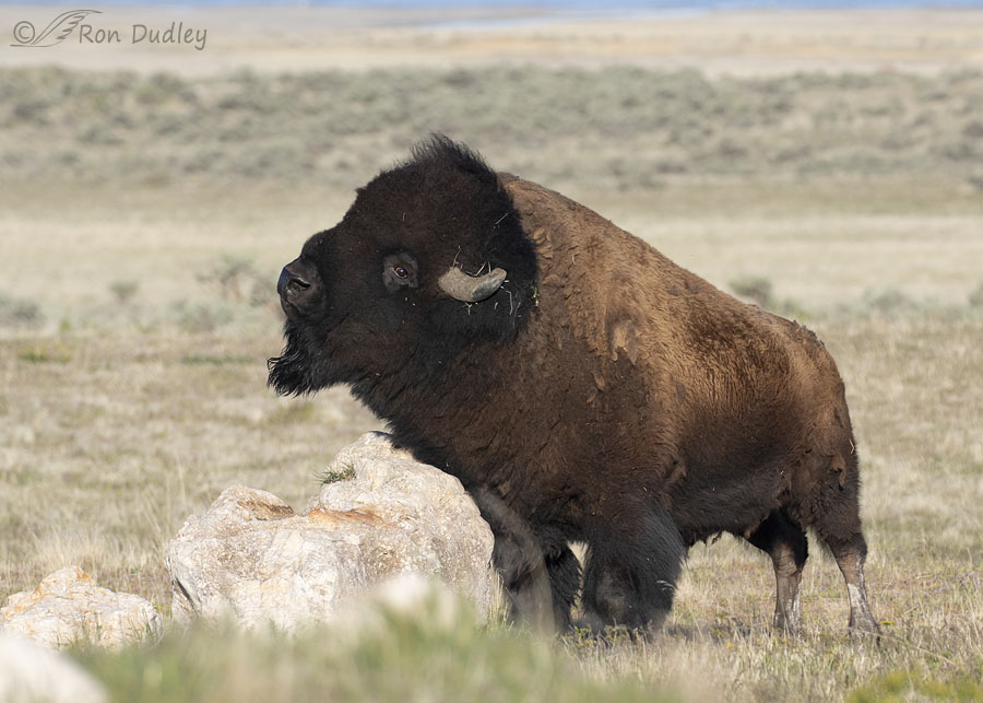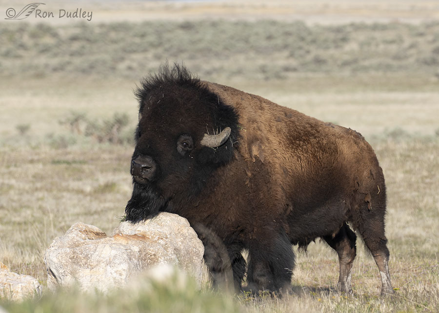A week ago today on Antelope Island I found this bison bull scratching his chest on one of the large Tintic Quartzite boulders that are so prevalent on the north end of the island. He was rocking back and forth and alternately throwing his massive head upward, which made the long dark hairs on top of his head stand on end momentarily.