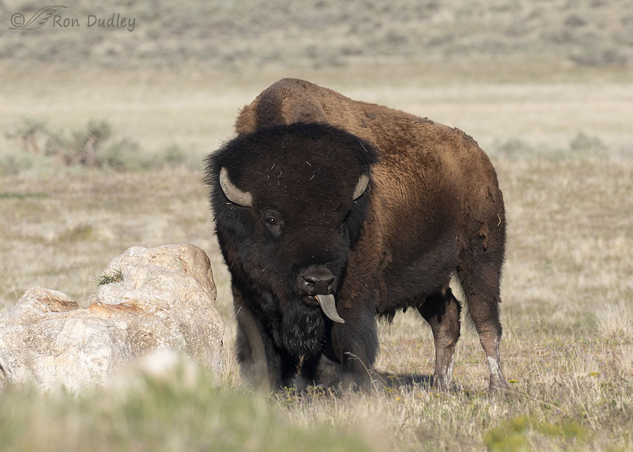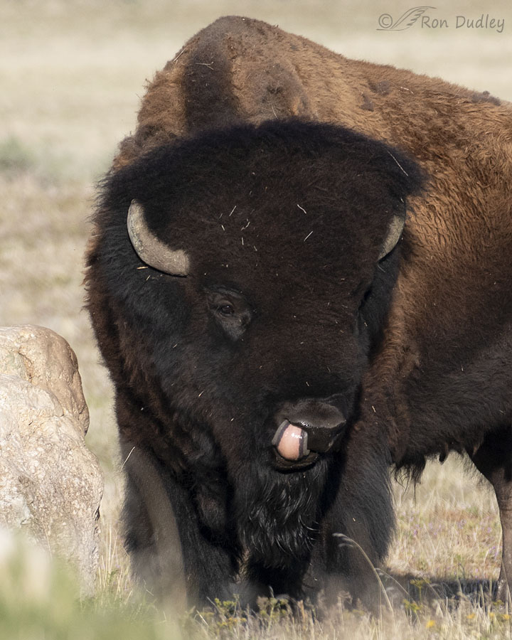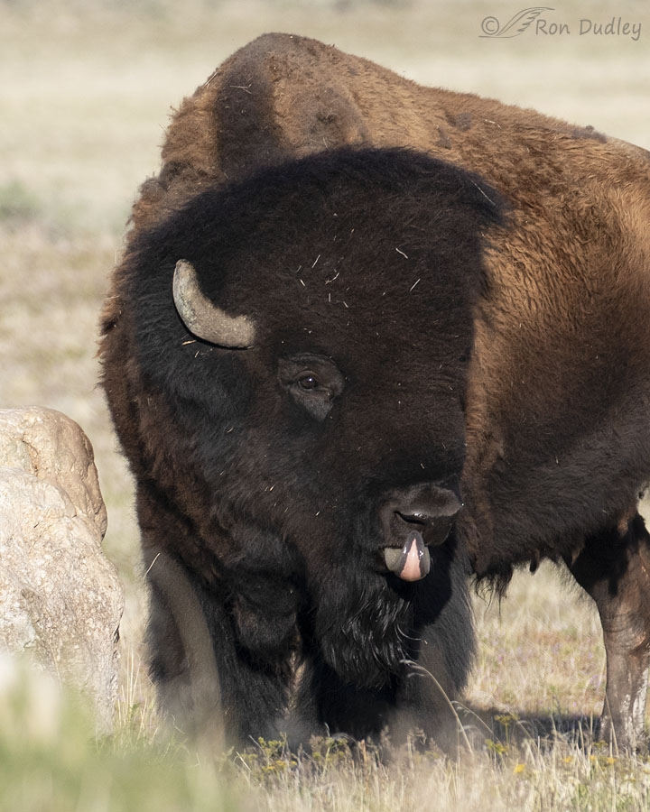 Then he started with some impressive and long-lasting tongue gymnastics. Bison tongues are longer than one might expect and they’re mostly blackish gray, with a…