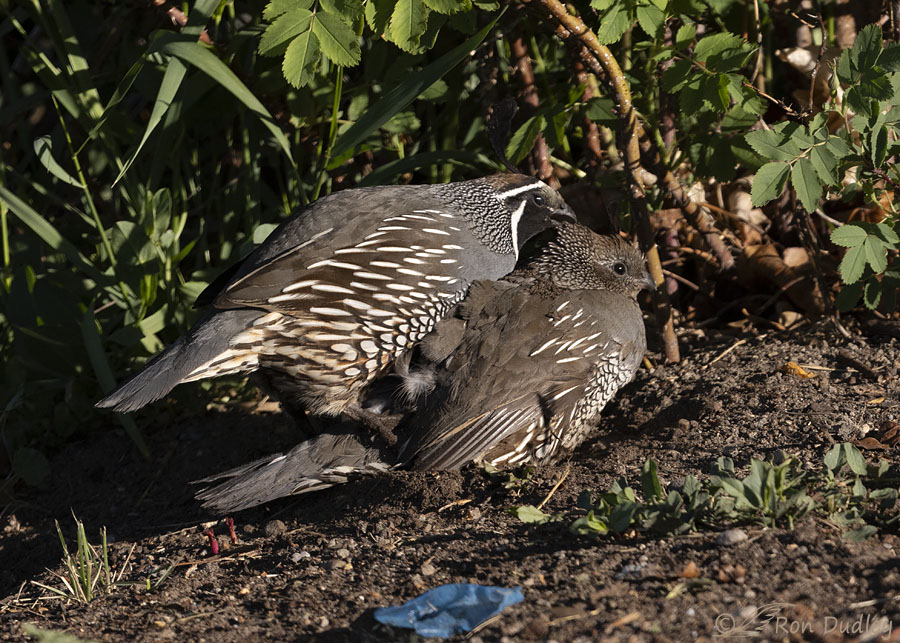 Faster than I could follow with my lens, the male popped out of his bathtub, mounted the female and mated with her – or at least tried to. Here’s part of what Cornell has to say about the mating process in California Quail: