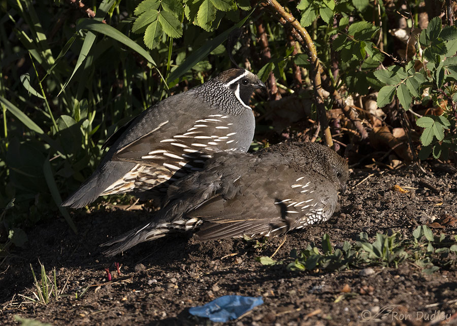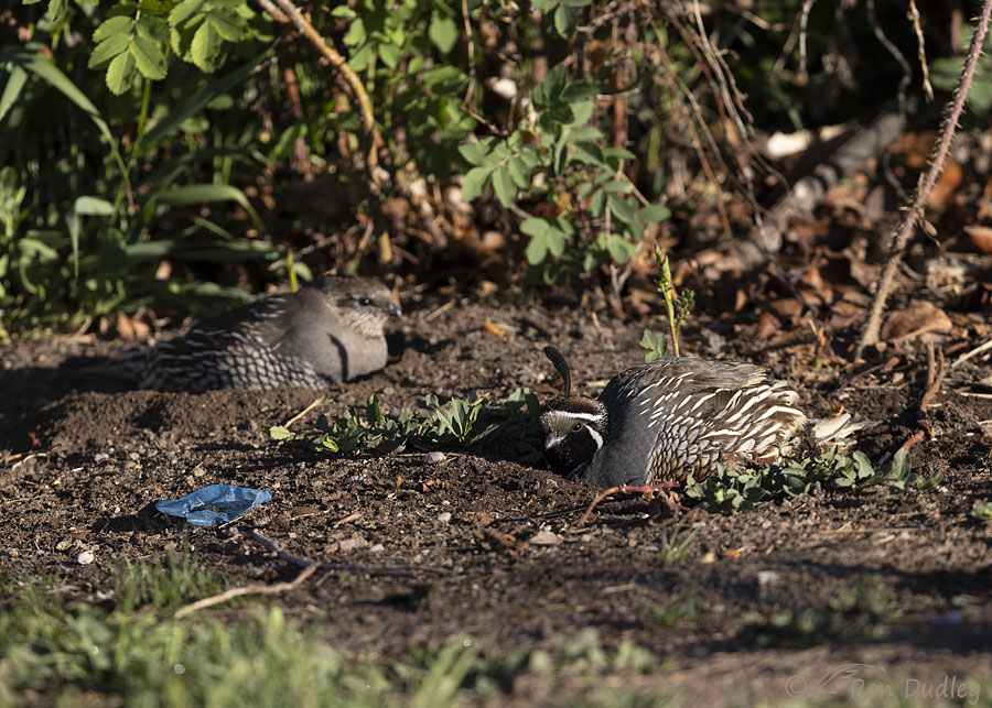 Remarkably illustrated mating story. Excellent photos, information, and good citizen award for picking up the trash. We have Gambel’s Quail in the backyard and all over town at this time of the year. They are everywhere and sadly many get hit by cars running across streets. One year years back we had a small tree planted in an old wine barrel on our front patio. Quails nested there and mated. Along the way she disappeared. No problem he took over and sat on the eggs every day. Had 16 eggs hatch and from that he ended up with 14 healthy living chicks. It was really a fun day watching him down on the ground encouraging the more cautious ones to jump down to the ground, but eventually he got them all and they ducked under the gate and of they went into the world. When you think of all the dangers facing these tiny little guys I would be surprised if half of them made it to adulthood.