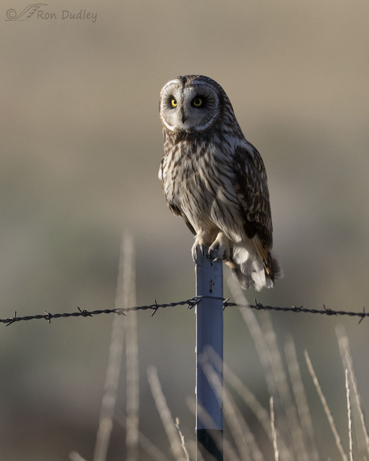 The owl, perched on a metal fence post, was much closer than the owls I posted three days ago but ‘he’ was strongly sidelit or even nearly backlit, depending on what direction he was turned on his perch. For most of the time I was with him he was hunting the tall grasses to the right so he was turned that direction, which kept his face in shade.