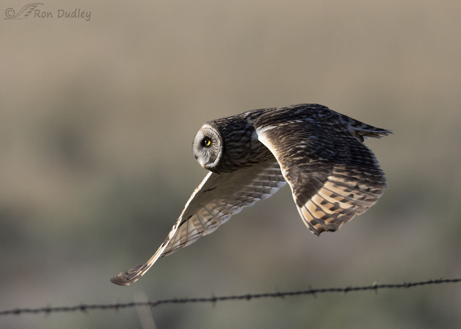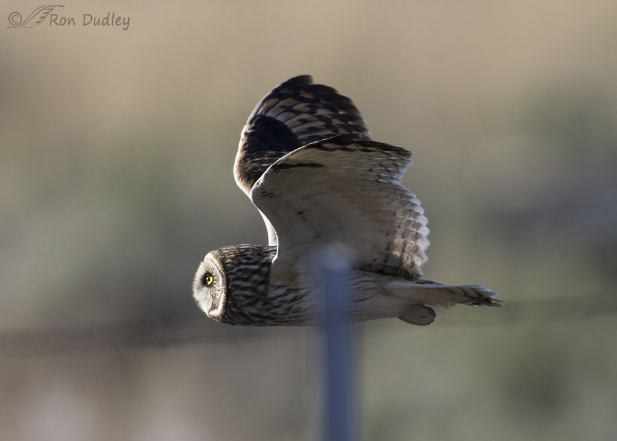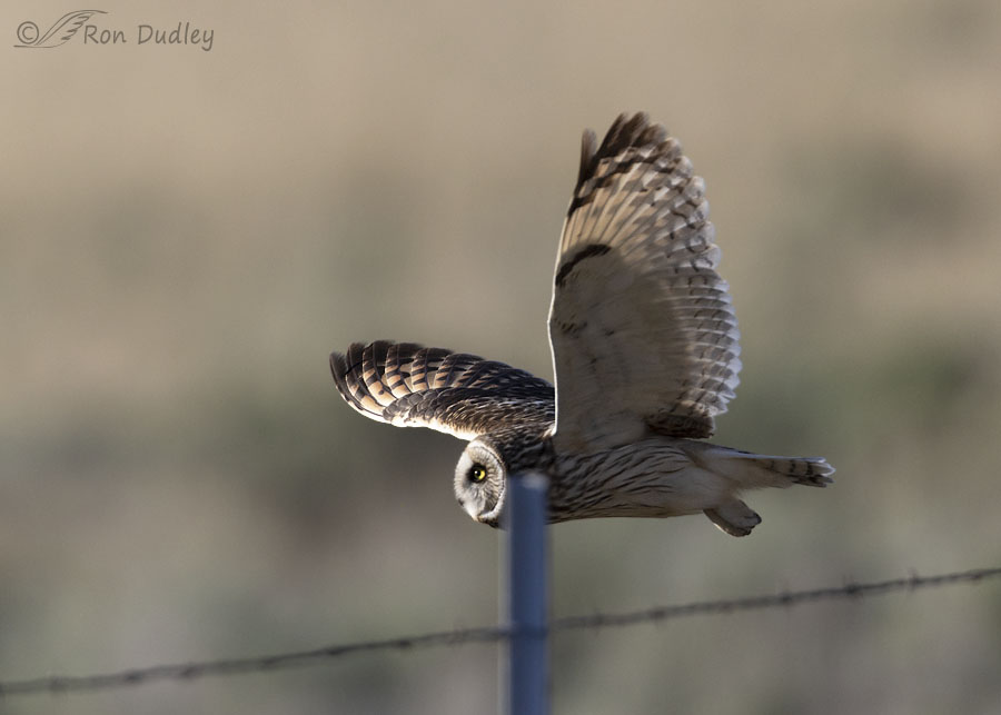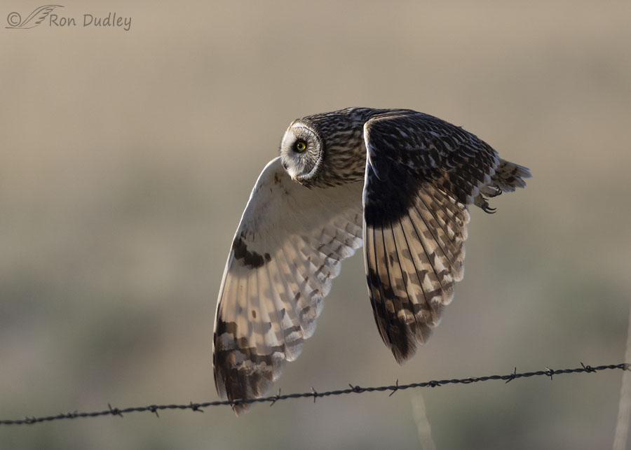 Since he was headed to another fence post far behind me, he seemed to be following the upper strand of barbed wire which I call “flying the wire”. That made me more than a little nervous because this owl was only a couple of hundred yards away from the strand of barbed wire I had to cut in order to free Galileo, the fledgling Short-eared Owl who had been snagged by barbed wire in June of 2016.