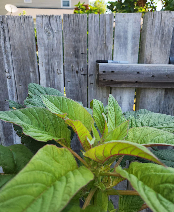 Here we see amaranth growing against my back fence. That stuff grows very fast and tall so I planted it there to provide privacy from neighbors. As I sit on my patio looking out toward the garden it’s obvious to me that my amaranth is growing like it’s on steroids.