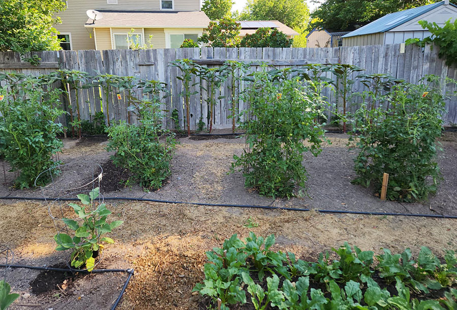 - Tomatoes. Nine tomato plants of five different varieties growing in a long row. My garden gets slightly less than an optimal amount of sunlight, so my tomatoes aren’t as early as those of some gardeners. I should be eating my first BLT’s with garden tomatoes in a couple of days.
