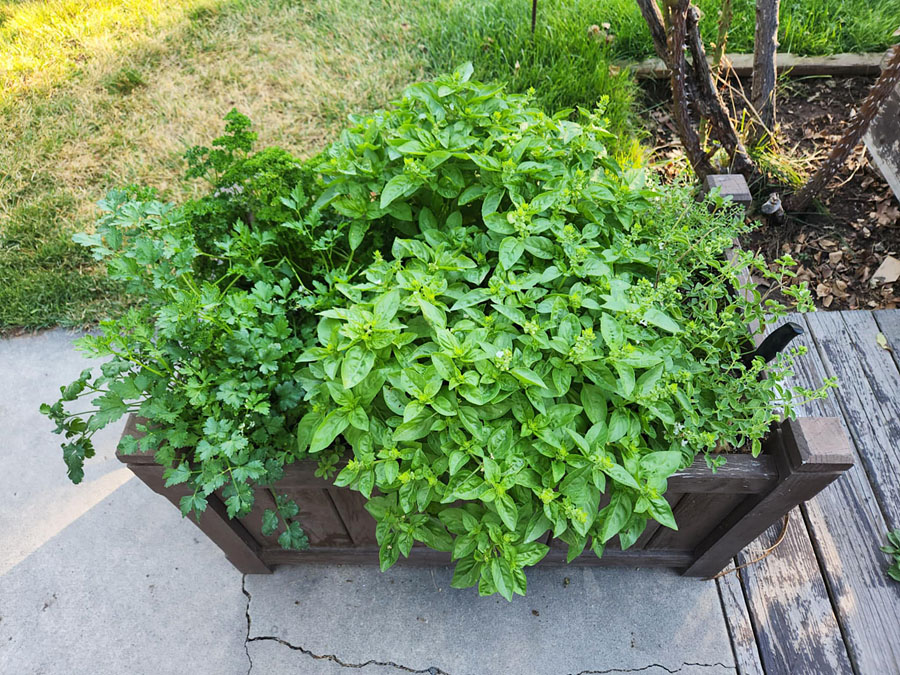 Part of my herb garden in a planter I built decades ago. Two types of parsley, basil, marjoram and thyme, growing right outside my kitchen door. Yes, my basil needs deadheading again. I have oregano growing in its own pot just out of frame to the right.