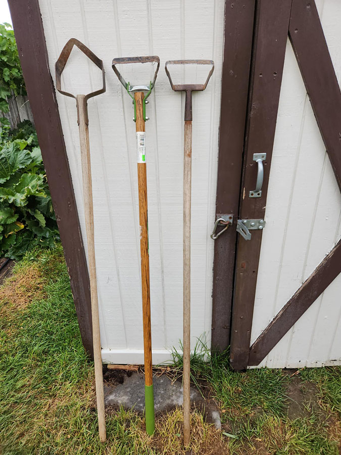 - Use a scuffle hoe for weeding. I think traditional hoes are close to worthless, at least for weeding, although I do have one. Scuffle hoes are quick and easy to use and they’re very effective. I have three of them but the only one I ever use is the ancient one on the right that I inherited from my dad. It’s lighter than the others and from use its working blade is very sharp, so it cuts through soil and weeds with ease. I believe that hoe I got from my dad is over 50 years old. Maybe significantly older than that. I tend to like old stuff.