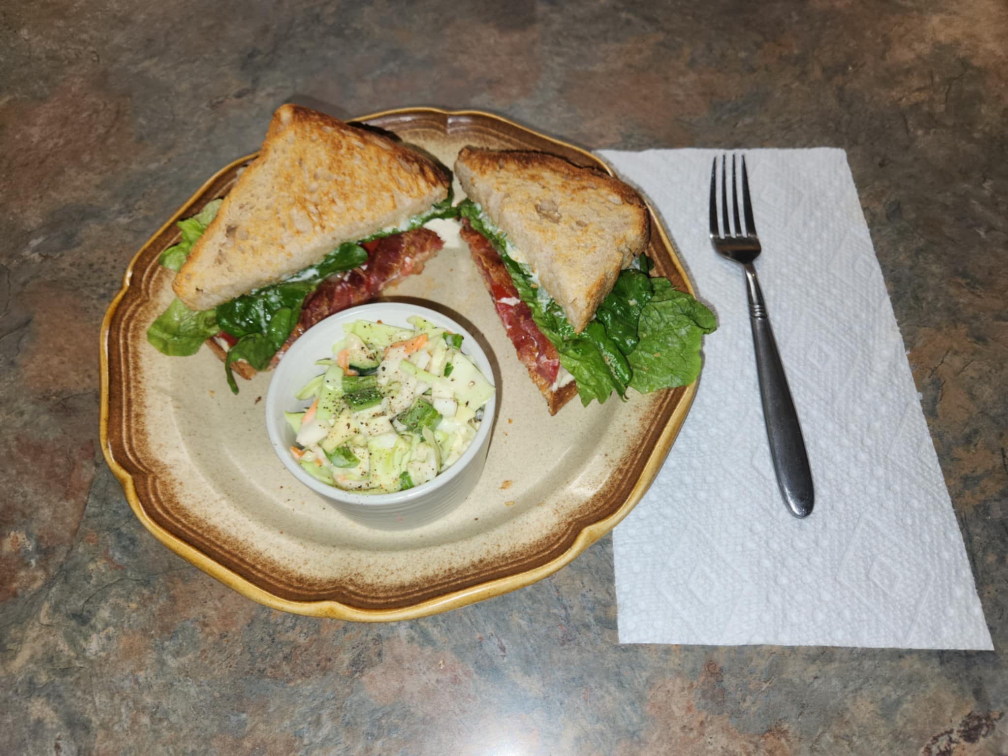 I’m no foodie so I don’t take good food photos but this was my dinner last night – a BLT with garden tomatoes and good sourdough bread, toasted. You can’t see the tomatoes very well but they’re under the bacon – sliced thick, juicy and delicious. Homemade coleslaw is the side.
