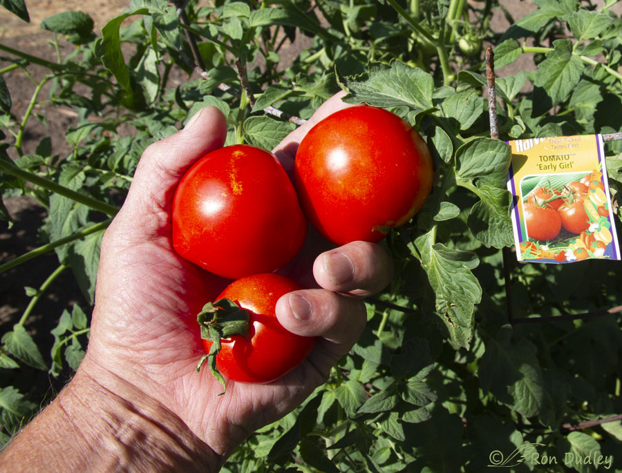 I harvested the smallest of these three tomatoes two days ago but it wasn’t large enough for a BLT so I had to wait. Then, yesterday afternoon, I found the two larger tomatoes hiding near the base of one of my Early Girl tomato plants.