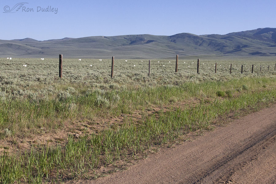 So some ranchers have allowed organizations like the Nature Conservancy to install bright white fence flags on their barbed wire fences. The flags are easy to see and research has shown that they significantly reduce grouse/fence mayhem. I took this photo on June 19th in one of the more remote areas of the valley.