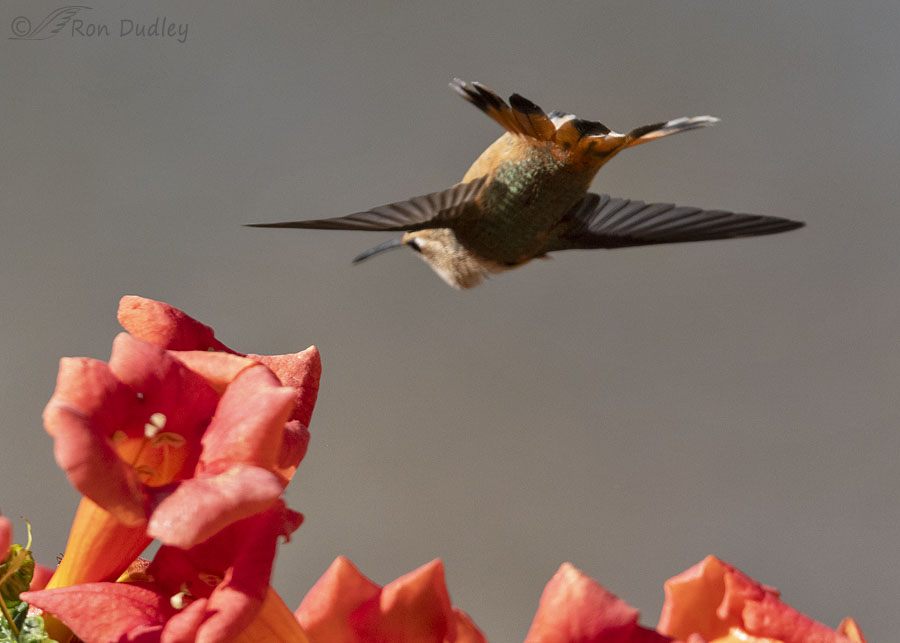 Earlier this month this Rufous Hummingbird was frustrating me because it kept landing and burying its head in the trumpet vine flowers instead of feeding while still in flight. I didn’t need any more headless butt shots like this one.