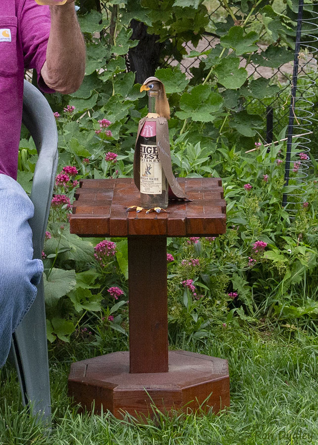 I deem the occasion of my salute to my readers to be worthy of sacrificing the last precious dregs of High West Whiskey (from High West Distillery, Park City, UT) from the bottle gifted to me three years ago by my friend April Olson to encourage my recovery from back fusion surgery. Knowing my fondness for raptors, April even took the time to dress the whiskey bottle up as a Red-tailed Hawk.