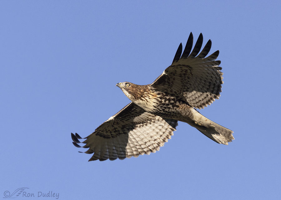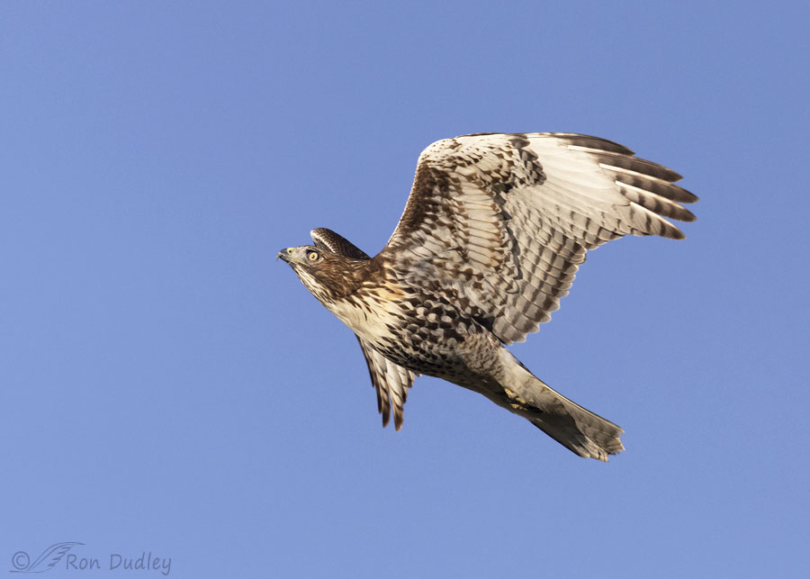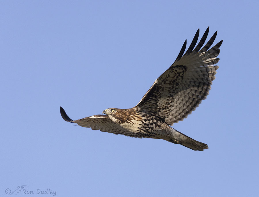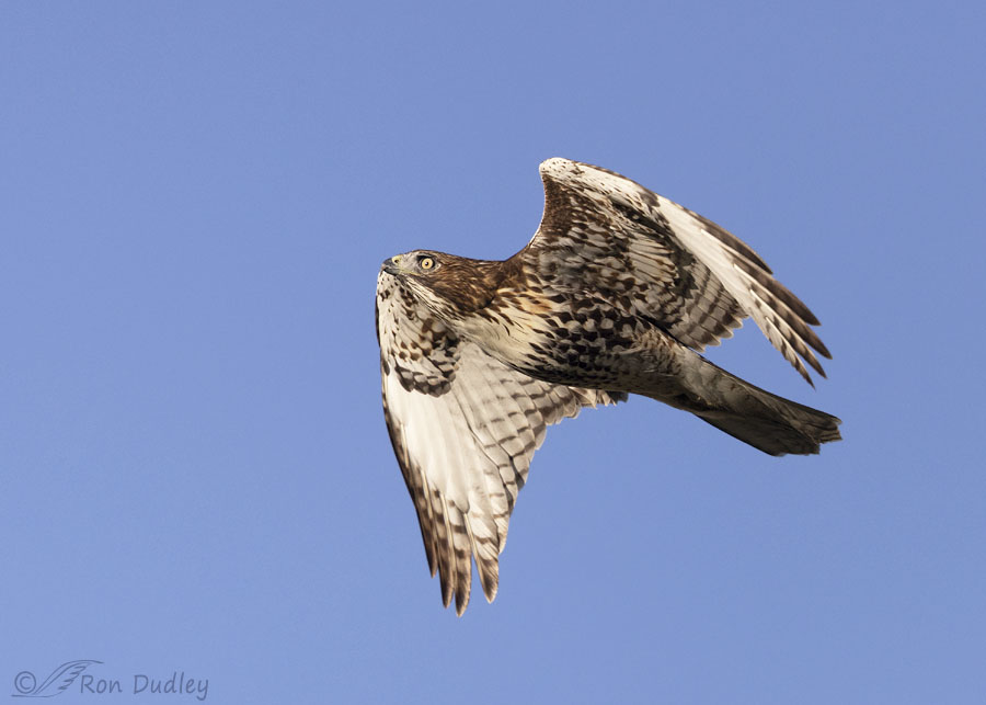 Readers know that I’m not particularly fond of photos of birds in flight with plain blue skies in the background but I was still happy to get these flight shots of the red-tail that I’d been trying to find for so long.