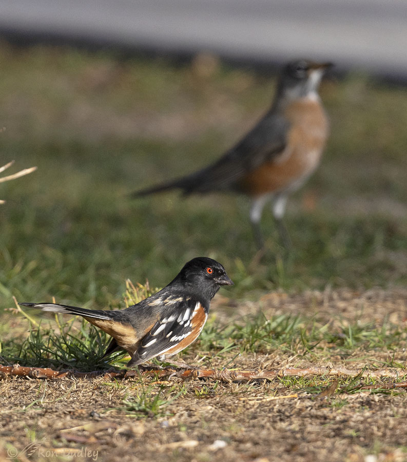 His frenetic feeding activity often attracted the attention of other birds, including robins and three species of sparrows (House, Song and White-crowned). Here we see the towhee and a robin eyeballing each other.