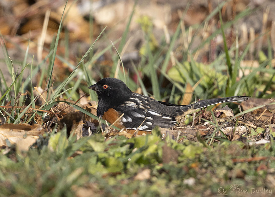 “Twitchy and fast”… Just like a Spotted Towhee. One more reason to leave the leaves. I love hearing about how deep the bilateral scratching got him. And I’m curious what the other two sparrows were.