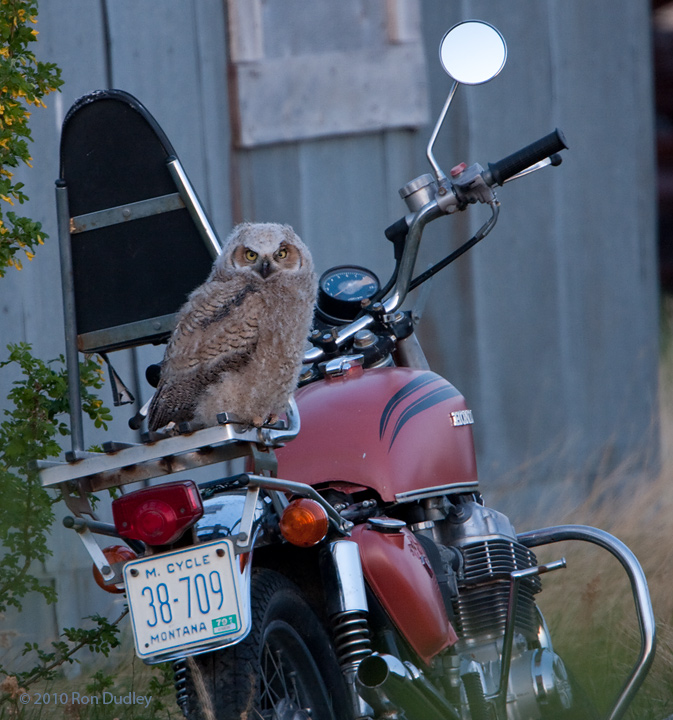 great horned owl fledgling on a motorcycle in montana